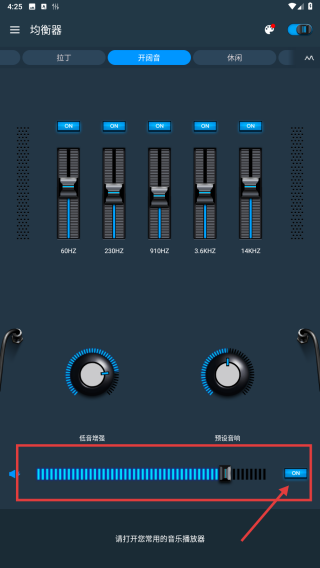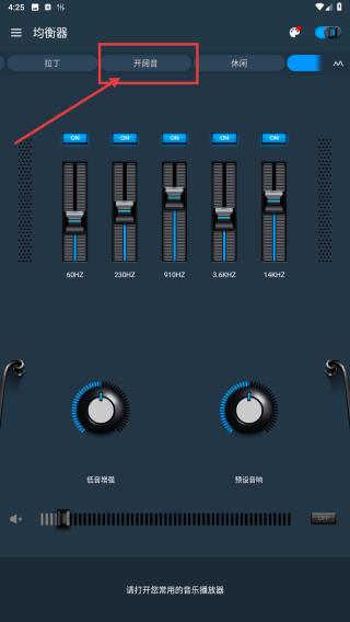 1. 开启均衡器应用程序,轻点开阔音效模式,切换至该音频效果,对音乐风格进行调整。