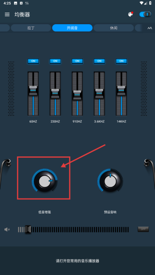 2、音效与风格调节:进入均衡器主界面后,既能够手动拖动滑块对不同频段参数进行调节,也可以点击预设的音乐风格直接应用。要是想增强低音效果,可开启低音增强”功能,同时对其强度进行调节。