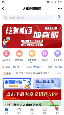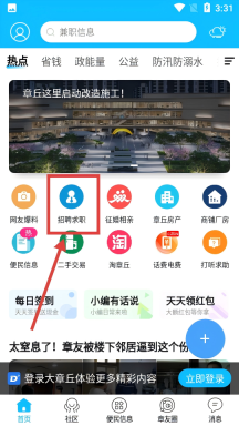 1、在首页找到并点击【招聘求职】板块,进入大章丘招聘网,即可启动招聘或求职的相关流程。