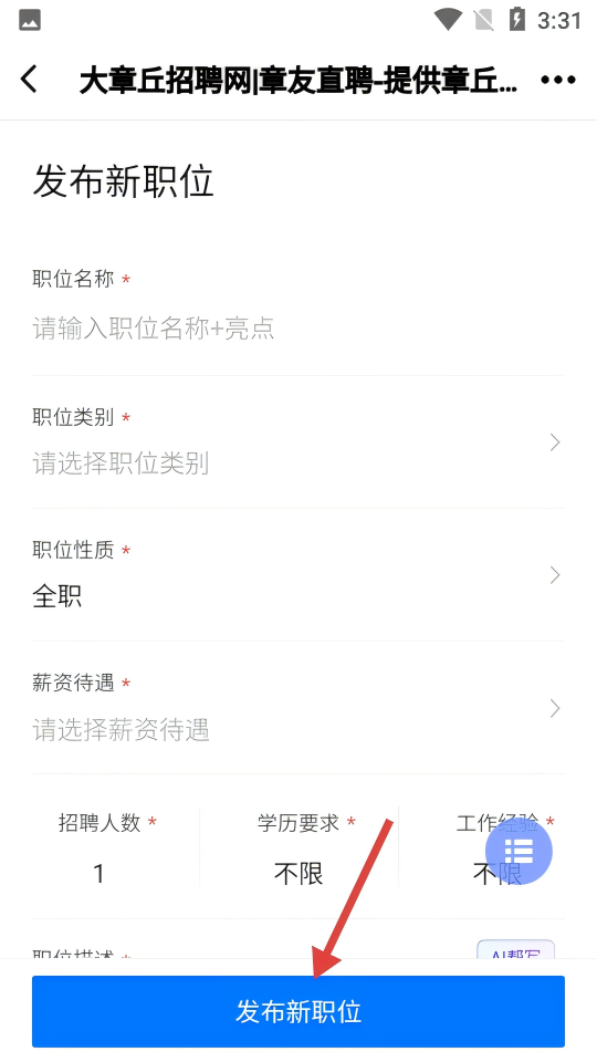 4、填写完职位名称、类别等相关信息后,点击【发布新职位】按钮,提交招聘信息等待审核。