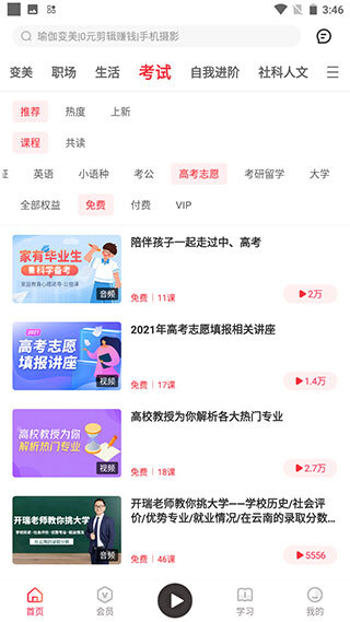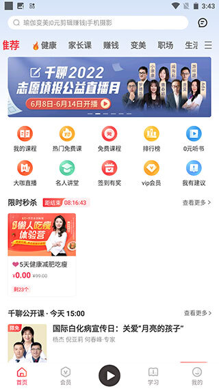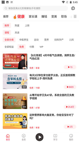 1. 【海量免费课程】拥有讲座、音频、视频等多种学习形式。每一门课程均经专业编辑推荐,品类十分丰富,覆盖健康养生、家庭育儿、副业变现等多个领域。