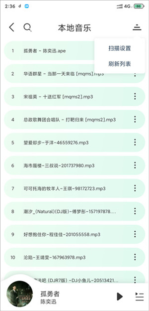 点击右上角的三条横线按钮,就能对本地音乐进行扫描设置和刷新列表操作。