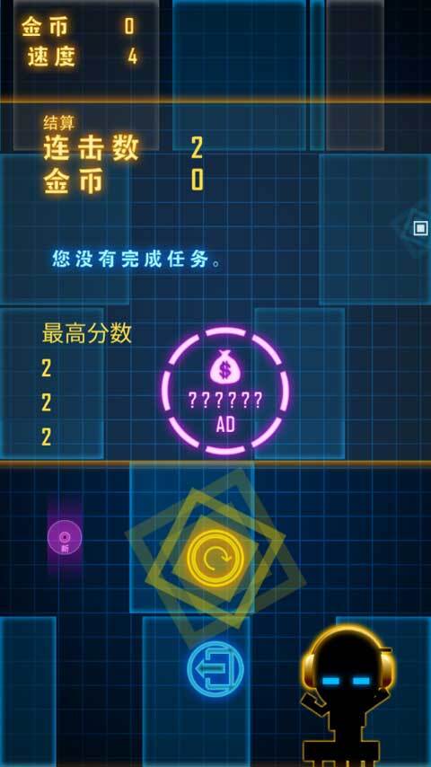游戏结束后,你能看到自己的最高连击数;要是没完成任务,就不会获得金币。