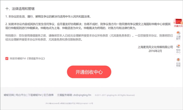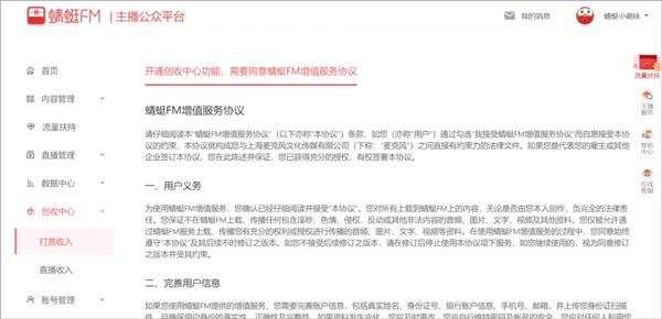 打开蜻蜓主播后台的创收中心,仔细阅读《蜻蜓FM增值服务协议》