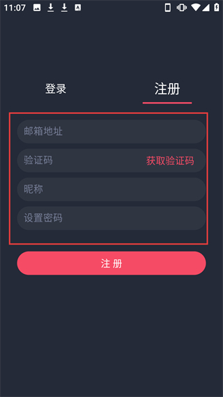 4、进入注册页面后,依次填写邮箱地址、验证码、昵称,并设置好密码,之后点击【注册】按钮,即可完成账号注册的操作。