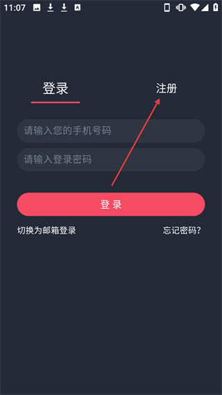 3、在登录页面点击顶部的【注册】选项,就能切换到注册页面。