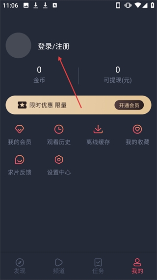 1、在频道页面点击底部的【我的】选项,就能进入个人中心页面。
