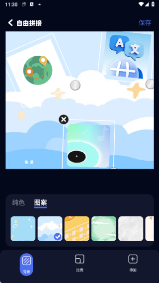 4、在自由拼接页面里,你可以挑选多张图片,接着对背景和比例进行调整。