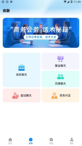 3、商聊板块提供各类商务话术内容,能帮助用户掌握更多聊天技巧,方便随时进行便捷互动。