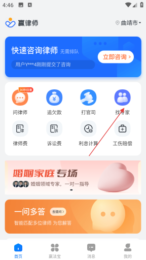 1、启动赢律师应用,在首页找到并点击【找专家】选项,随即进入专家筛选界面。
