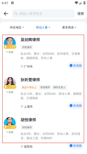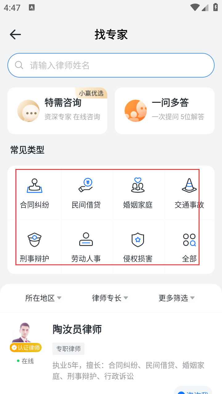 2在专家查找页面,可借助搜索功能、专业类型筛选以及地域选择等方式,定位到符合需求的律师。