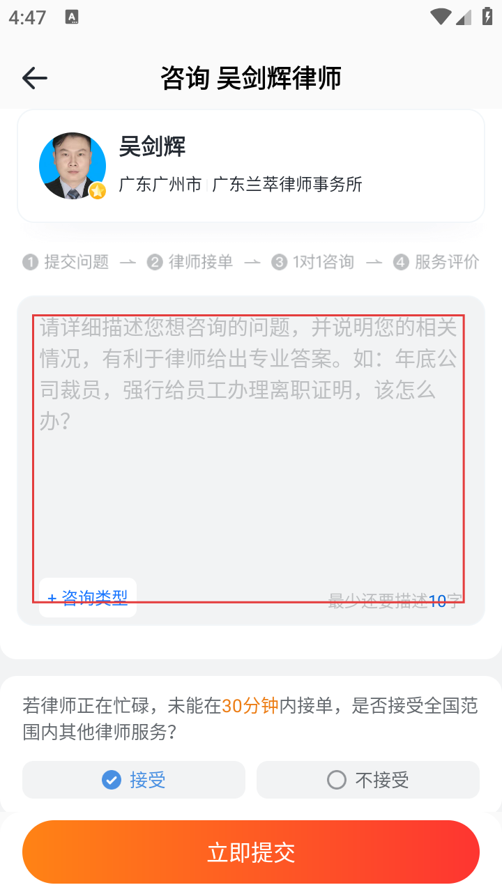 4在对应输入区域详尽阐述遇到的问题,选择合适的咨询类别,确认是否同意其他律师提供帮助,随后点击【立即提交】按钮,即可启动咨询流程。