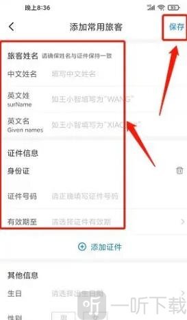 4. 进入添加常用旅客的界面后,依次填写旅客姓名、中文姓名、英文姓、英文名、身份证、证件号码以及有效期至这些信息,最后点击“保存”按钮。