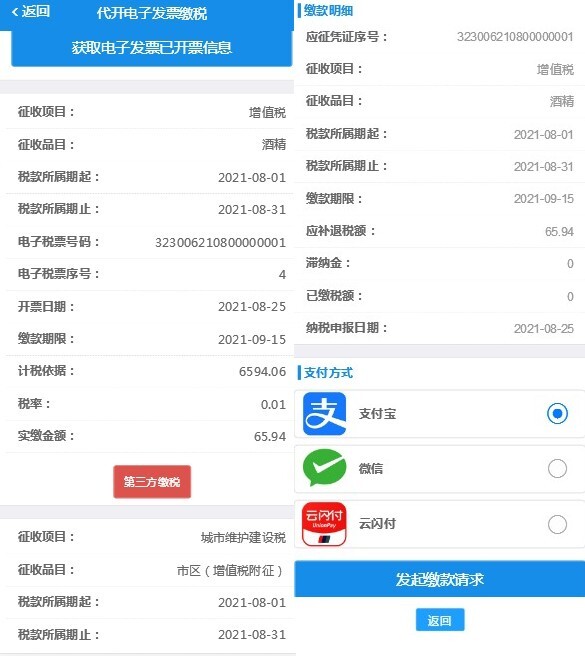 确认信息准确无误后,点击【第三方缴税】按钮,接着挑选合适的支付方式完成税款缴纳。