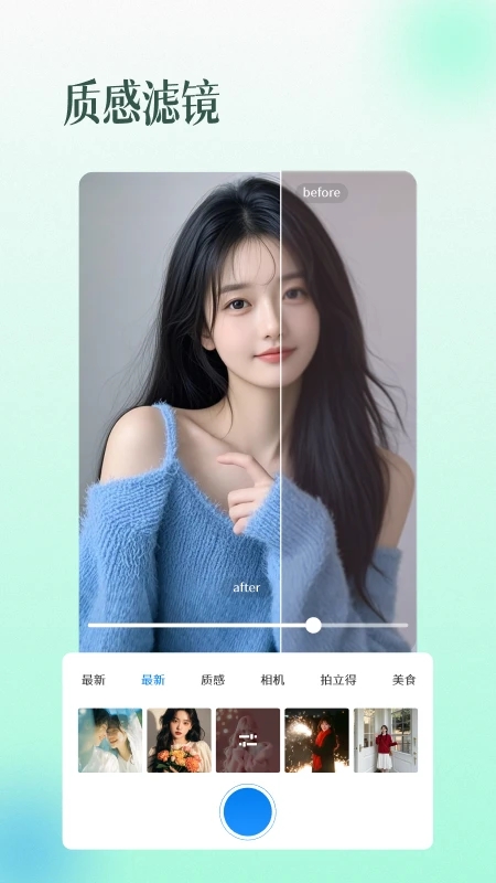 软件为用户提供了强大的滤镜相机,方便用户随时进行美颜拍照,记录精彩的瞬间。