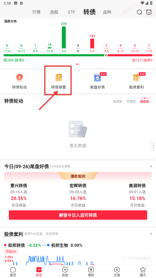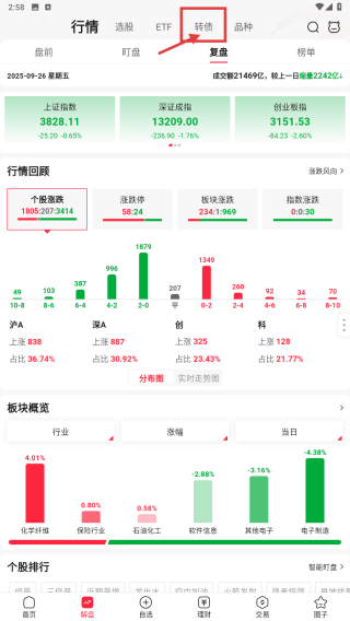 2、进入复盘页面后,找到并点击转债分类选项,随后浏览该分类下的转债相关功能列表。