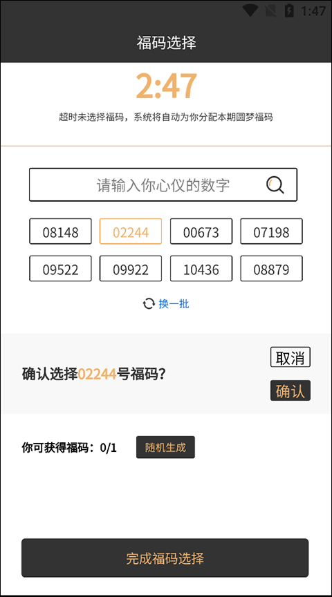 5、在此处输入你钟意的数字,点击确认按钮,最后完成福码的选择操作。
