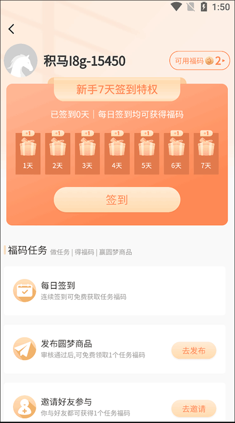 2、接着,在签到页面完成签到操作后,可点击界面右上角的“可用福码”按钮;
