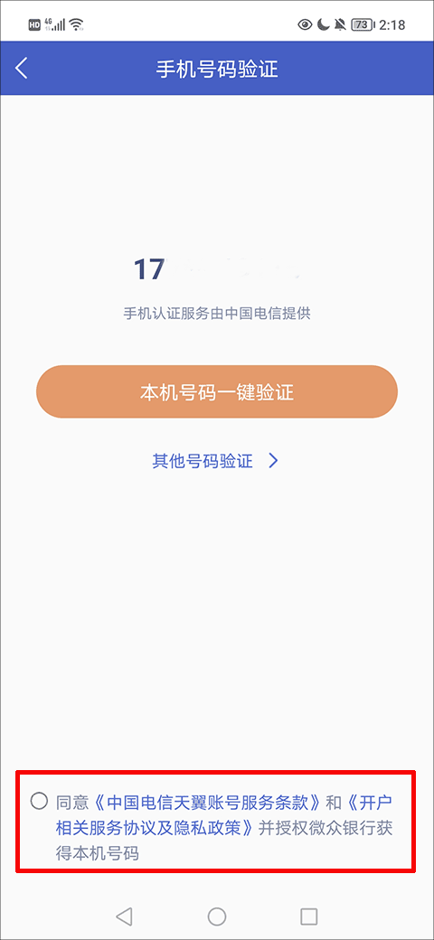 3、现在,用户可以在手机号码验证界面点亮下方的红色方框内的内容后找到并点击“本机号码一键验证”选项;