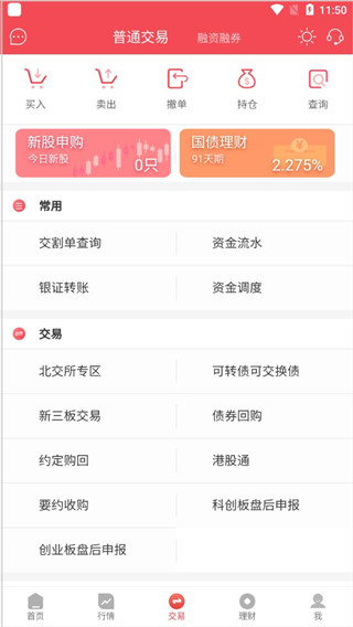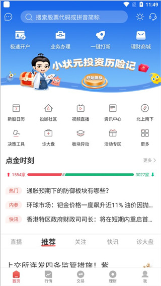 3、进入软件后,到首页可以看到:极速开户。业务办理、一键打新、理财商场;