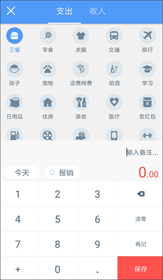 2、通过上方提供的图标,用户们可以选择自己的消费或者收入的标签,然后在下方输入相应的数据进行记录。