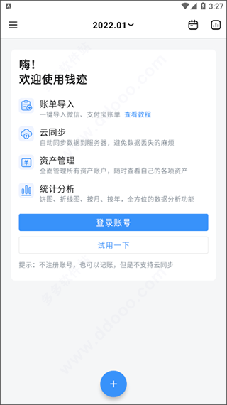 1、打开“钱迹”的首页之后,我们需要先登录自己的账号,然后通过底端的“+”按钮唤起记账功能,随时记录自己的日常收支数据。