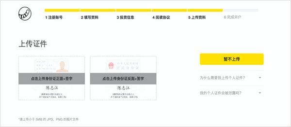请将身份证放在已准备的A4纸上,并在身份证下方的空白处签名,然后拍照上传。需正反面分别附签名拍照上传,所拍证件需四角齐全,字迹清晰,无反光;