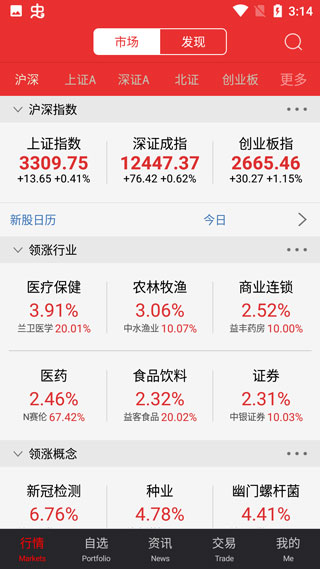 2、在行情页中,了解新股行情指数以及涨幅趋势